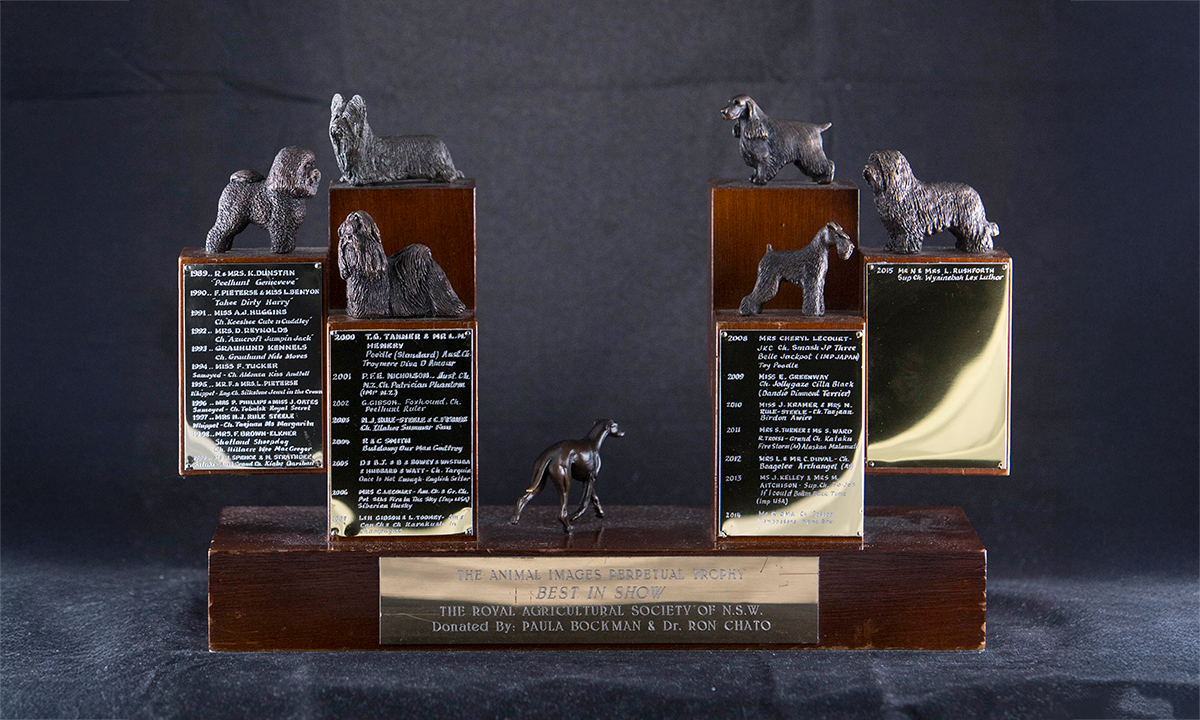 Trophy with seven cast bronze models of dogs on a stained pine multi pedestal stand. Trophy designed by Paula Bockman.